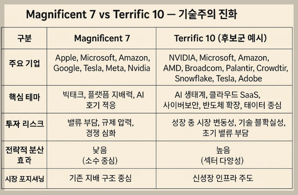 최근 미국 월가의 기술주 분석가들 사이에서 뜨거운 감자가 떠올랐습니다. 바로 오랫동안 시장을 주도해 온 소위 '매그니피센트 7 (Magnificent 7) '으로 불리는 거대 기술 기업들의 시대가 점차 변화의 국면에 접어들고 있으며, 새로운 성장 동력을 갖춘 '테리픽 10 (Terrific 10) '에 대한 심층적인 분석과 집중이 필요하다는 주장이 설득력을 얻고 있습니다.
