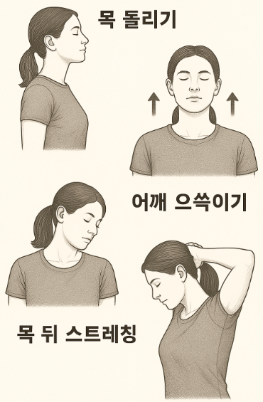 - 어깨 으쓱이기: 어깨를 천천히 들어올린 후 내리기를 반복해 긴장을 풀어주세요.
