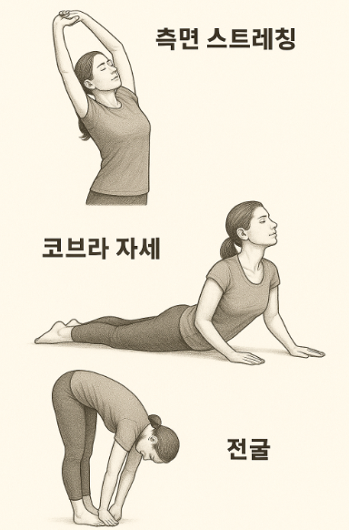 - 측면 스트레칭: 양손을 머리 위로 들어올려 손가락을 깍지 낀 후, 천천히 몸을 좌우로 기울여줍니다.