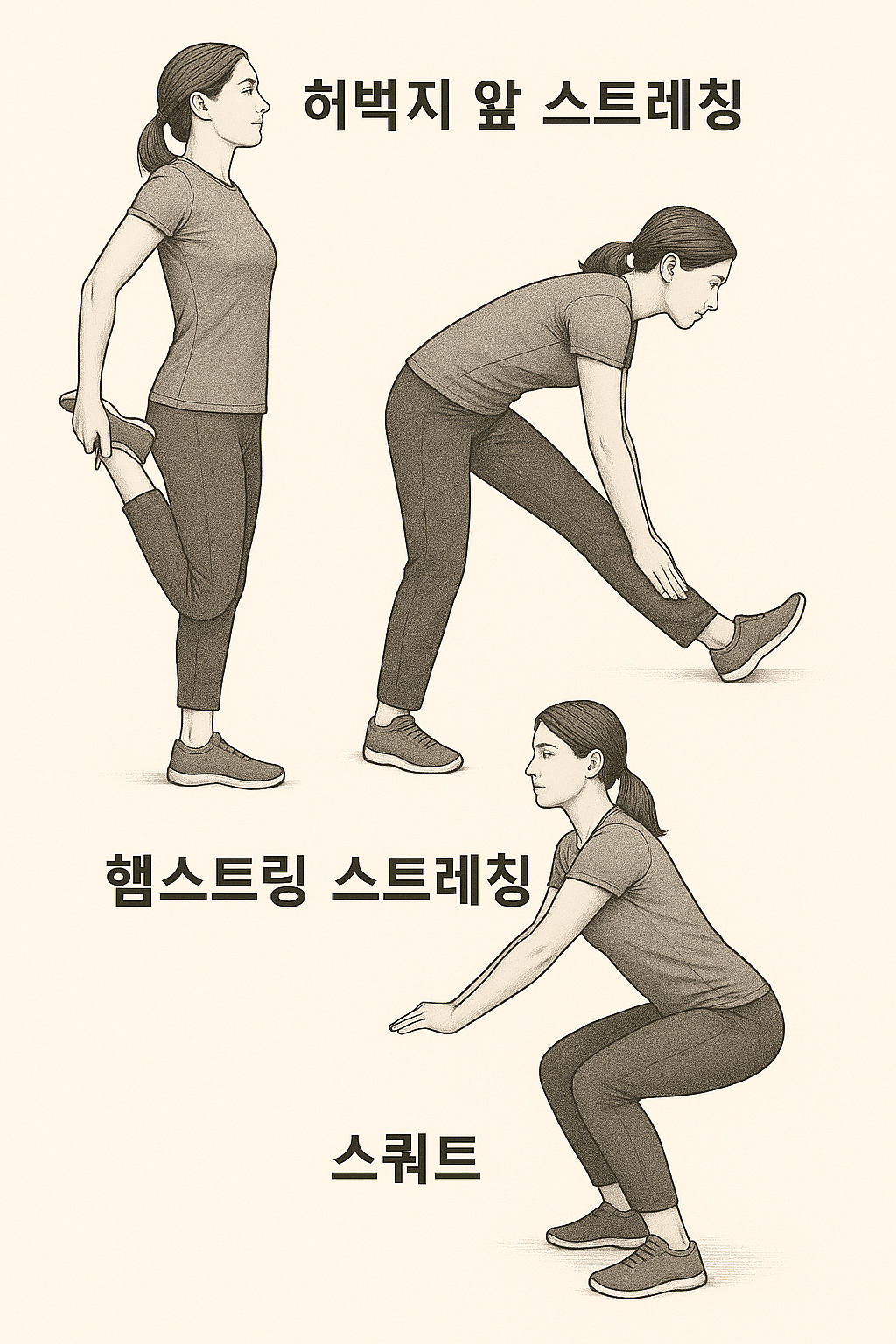 - 햄스트링 스트레칭: 한쪽 발을 앞쪽으로 내밀고, 허리를 굽혀 다리 뒤쪽을 늘려주세요.
