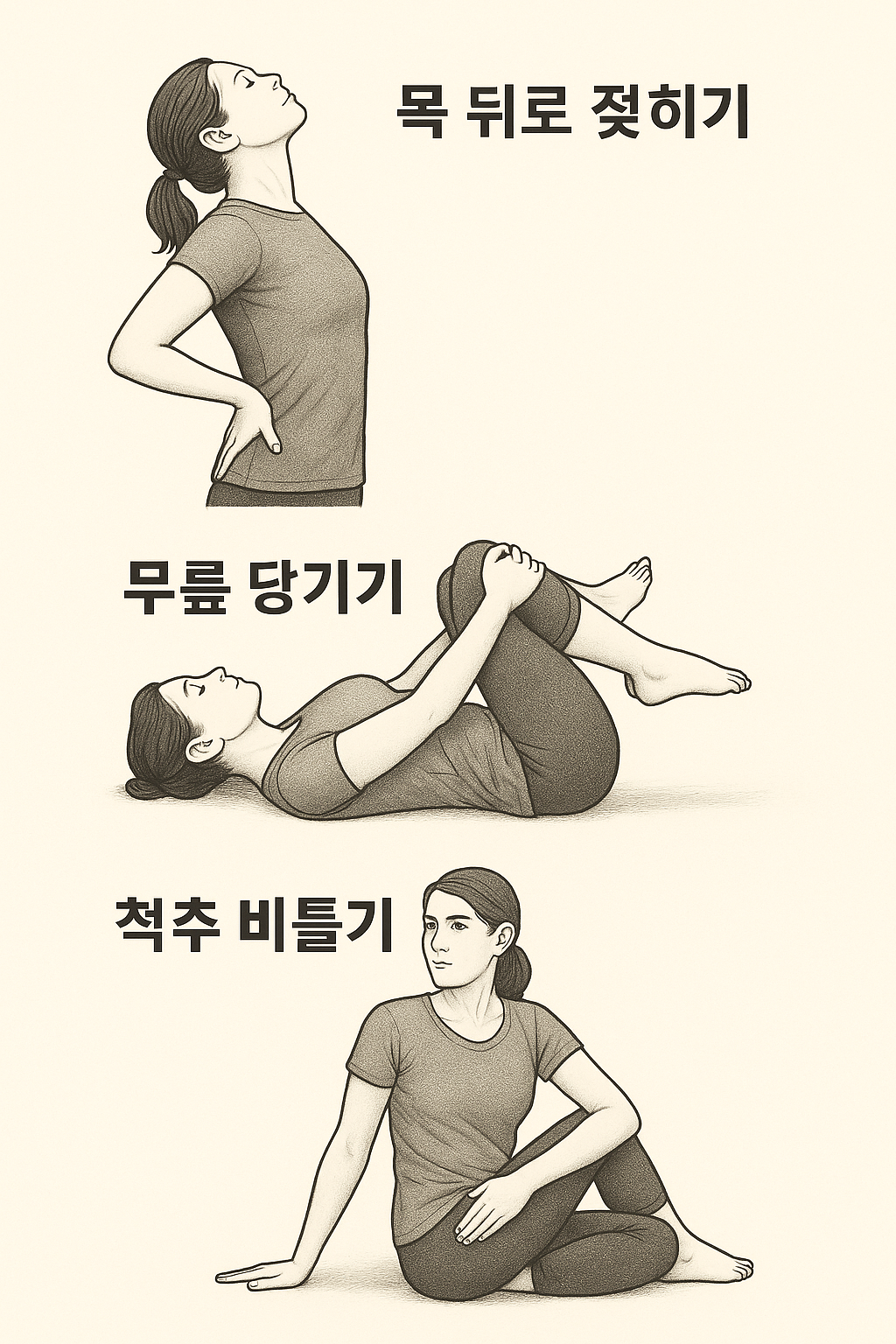 - 목 뒤 스트레칭: 손을 머리 뒤로 깍지 낀 상태에서 가볍게 고개를 앞으로 당겨 목 뒤쪽을 늘려줍니다.