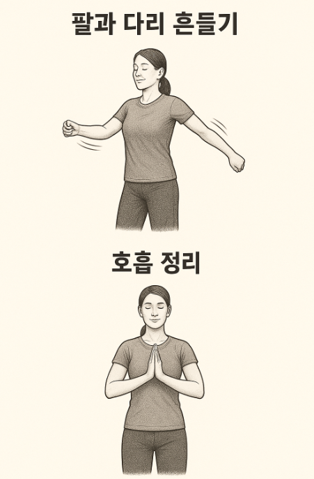 - 팔과 다리 흔들기: 서서 천천히 팔과 다리를 흔들며 긴장을 풀어줍니다.