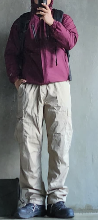 → 와인색 고어텍스 아노락 + 민트색 카고 팬츠 + 레트로 러닝화