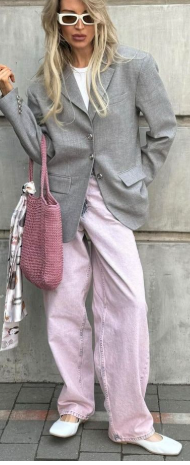 → 실버 크롭 재킷 + 벨벳 트랙팬츠 + 핑크 틴트 선글라스