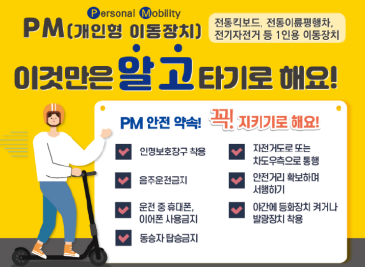 | 헬멧 착용 의무화 | 모든 탑승자 헬멧 착용 의무 → 벌금 2만 원 → 5만 원 상향 | 안전사고 예방 및 경각심 강화 |